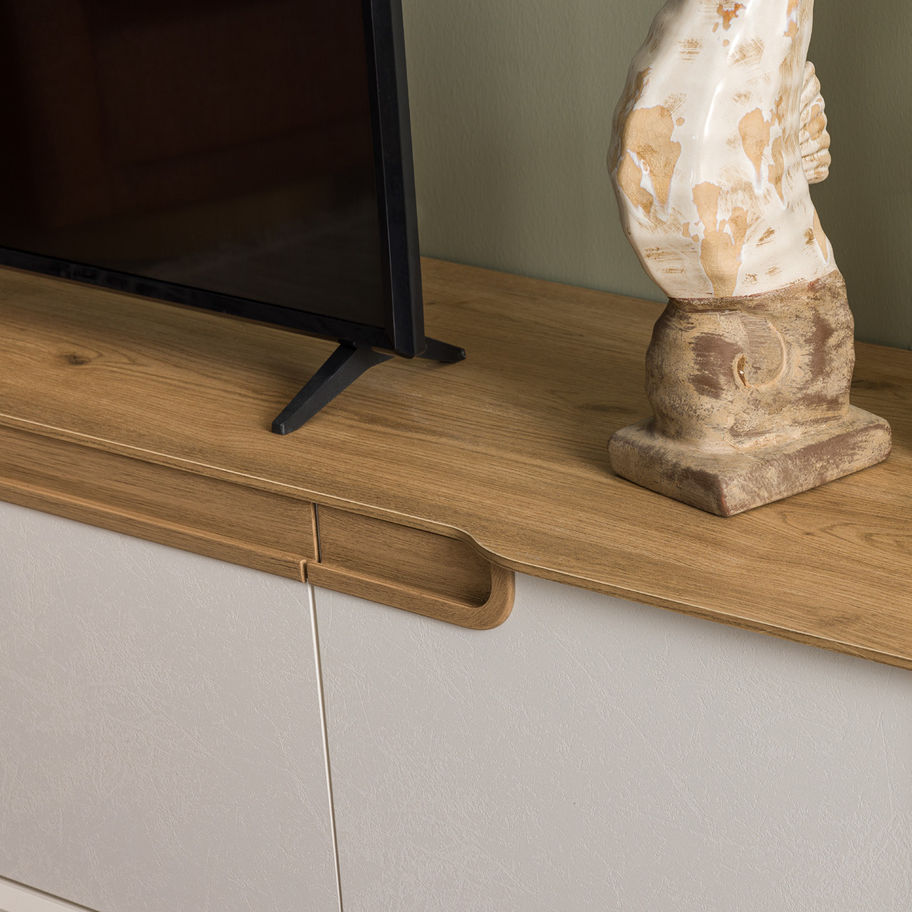 Bring a warm and natural touch to your living room with the Nova TV unit. Inspired by Scandinavian simplicity, this piece features soft cream doors, natural wood accents, and clean lines for a timeless design. Its spacious storage compartments and matching wall shelf provide both functionality and style. Perfect for cozy, modern interiors, Nova adds a calm and inviting atmosphere to any home.