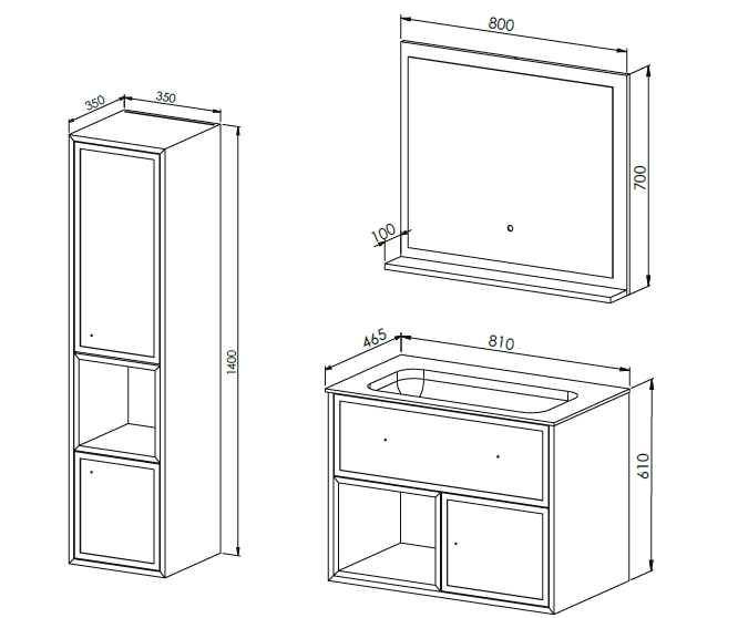 Products included in the set: Fog Free Bathroom Mirror (with LED) + Sink + Bathroom Cabinet and Wall Cabinet